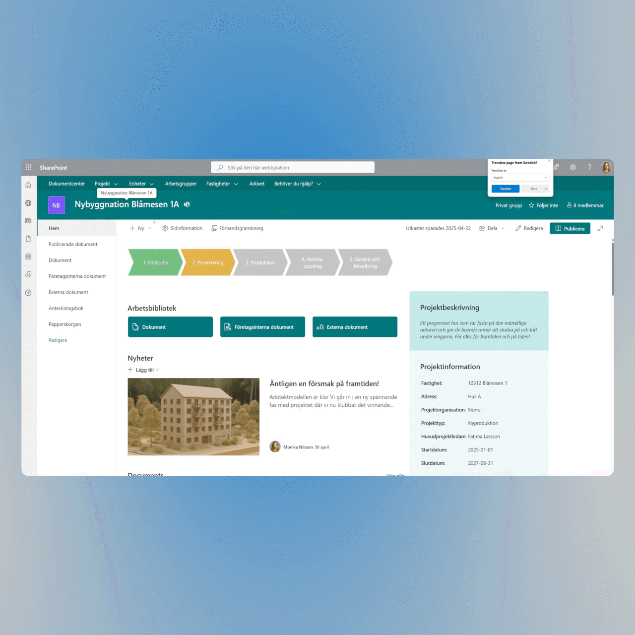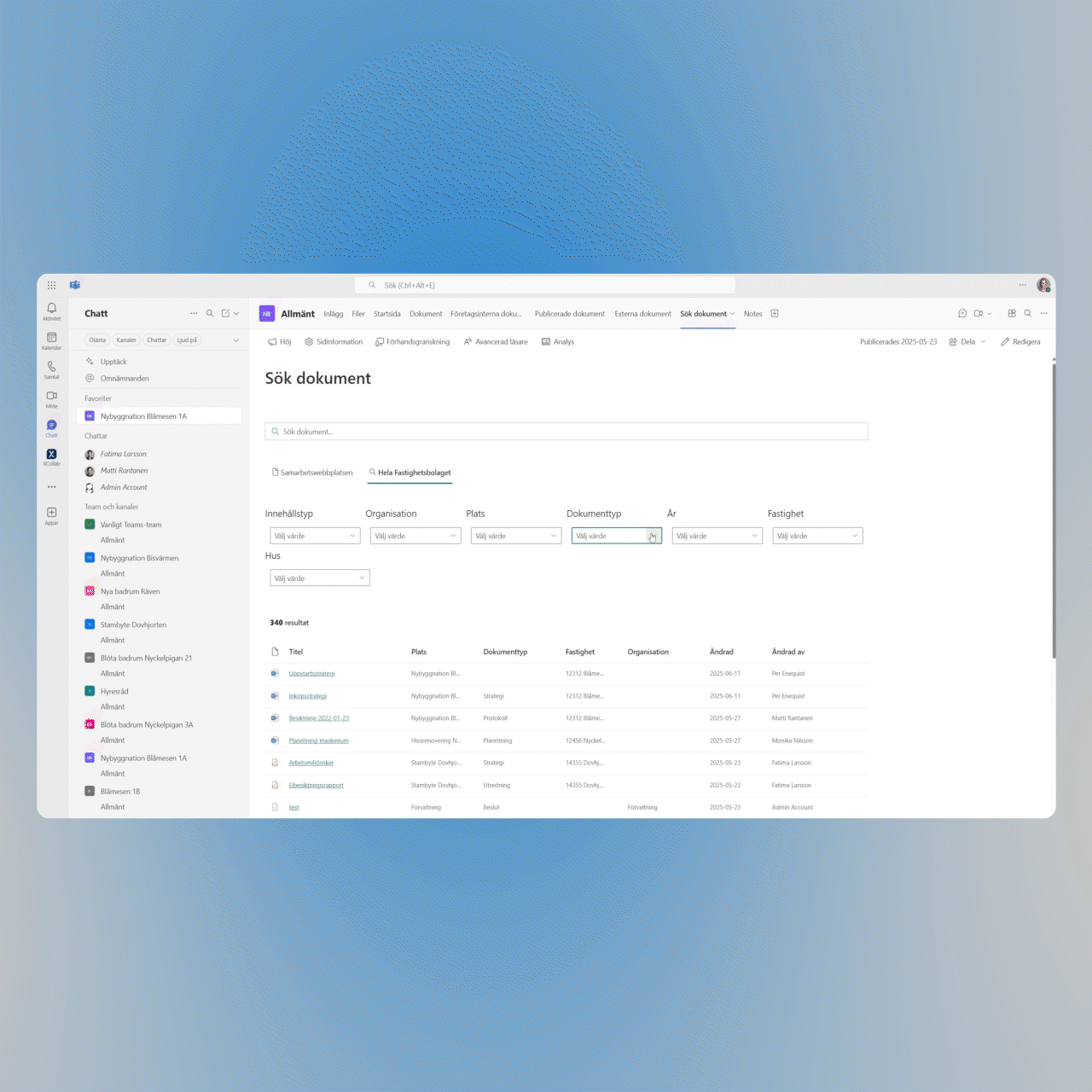 Samarbetsytan speglas i både Teams och SharePoint. Du väljer var du vill arbeta för maximal smidighet.